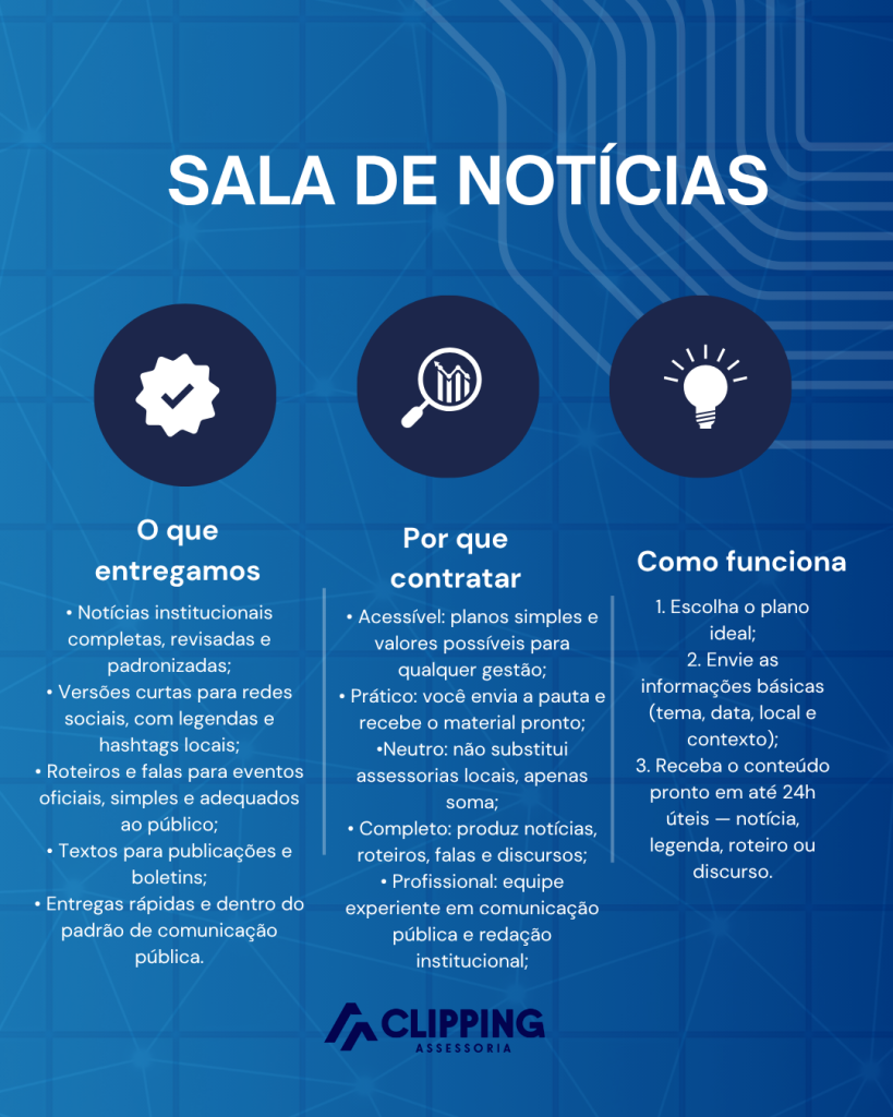 A “Sala de Notícias” é o novo serviço criado para facilitar a rotina de prefeituras, câmaras municipais e políticos, oferecendo textos institucionais, roteiros e discursos prontos para uso, produzidos com agilidade e linguagem adaptada para cada ocasião. O objetivo é atuar em apoio às assessorias de comunicação já existentes, oferecendo reforço técnico e editorial para quem precisa manter as redes e sites sempre atualizados.